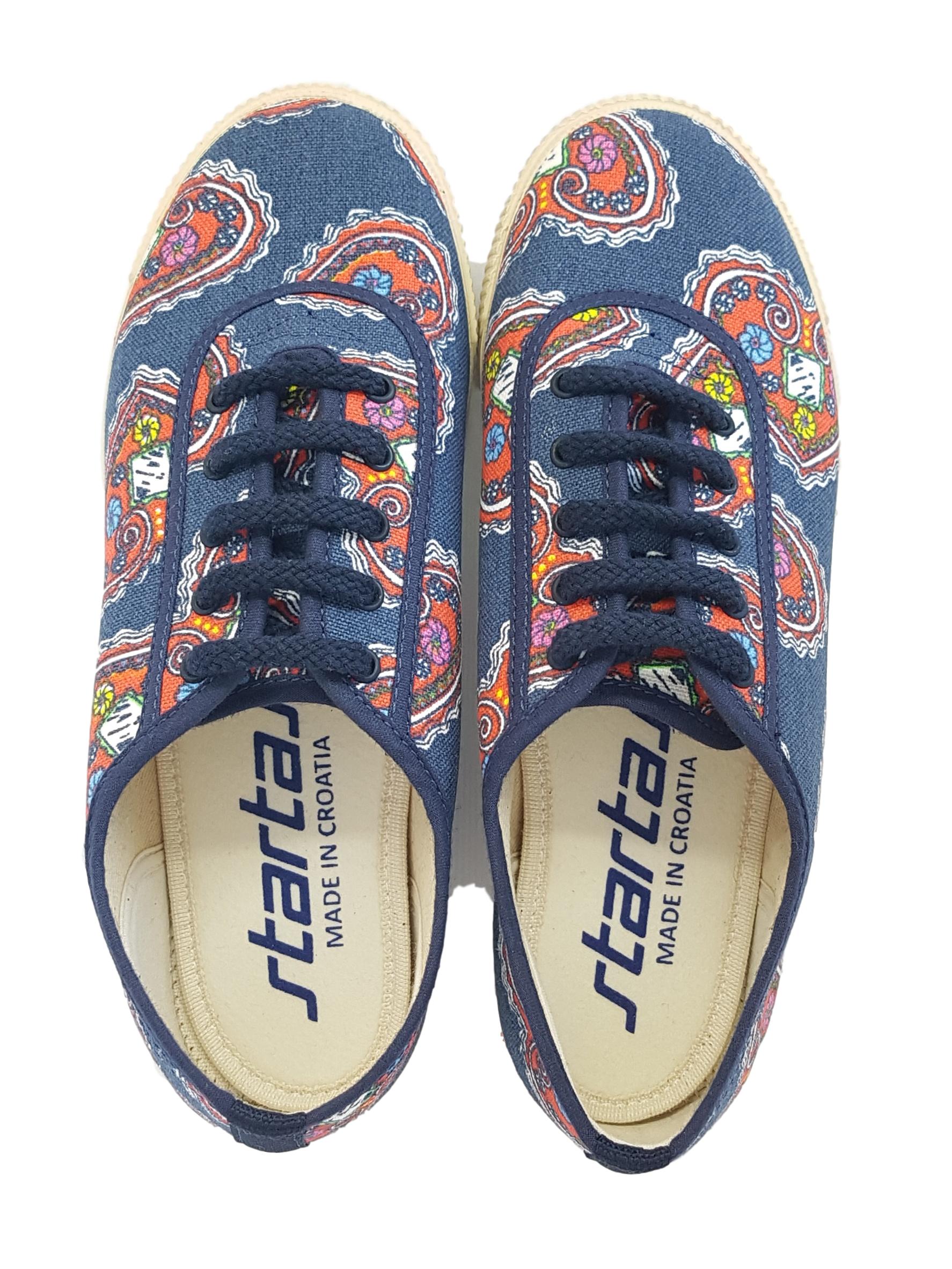 Experience the charm of Croatia with the Startas Croatian Hearts canvas shoe. Handmade using natural materials, this timeless sneaker features vibrant red "licitar" hearts on a rich navy background, accented by navy piping and laces for a sleek, cohesive look. The sand-coloured rubber sidewalls and iconic blue Startas sole combine style with durability, making these sneakers perfect for everyday wear with a touch of cultural warmth. Step into comfort and tradition with each pair, crafted to bring a unique story to your footwear collection.