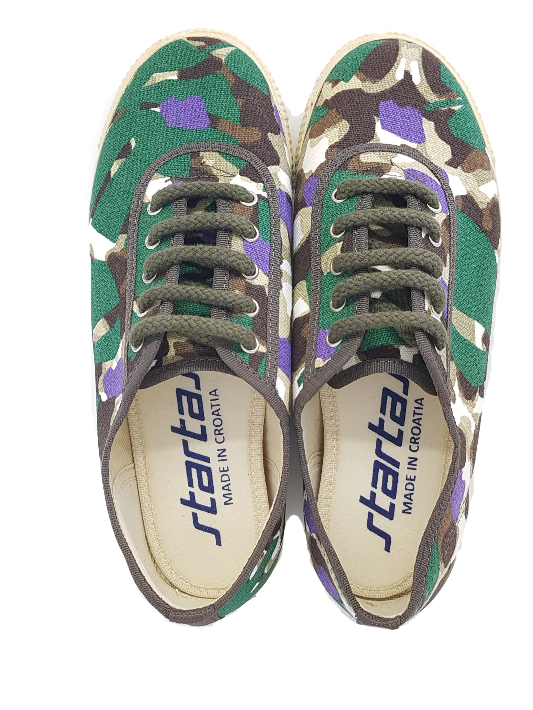 Unleash your adventurous spirit with the Startas Dark Jungle canvas shoe. Featuring a timeless cheetah print background brightened by lively green monstera leaves, these classic canvas sneakers combine playful style with practical durability. Sand-coloured rubber sidewalls protect your step, while the iconic Startas blue vulcanised sole ensures comfort and traction. Handmade in Croatia, these shoes bring fun and flair to every outfit.